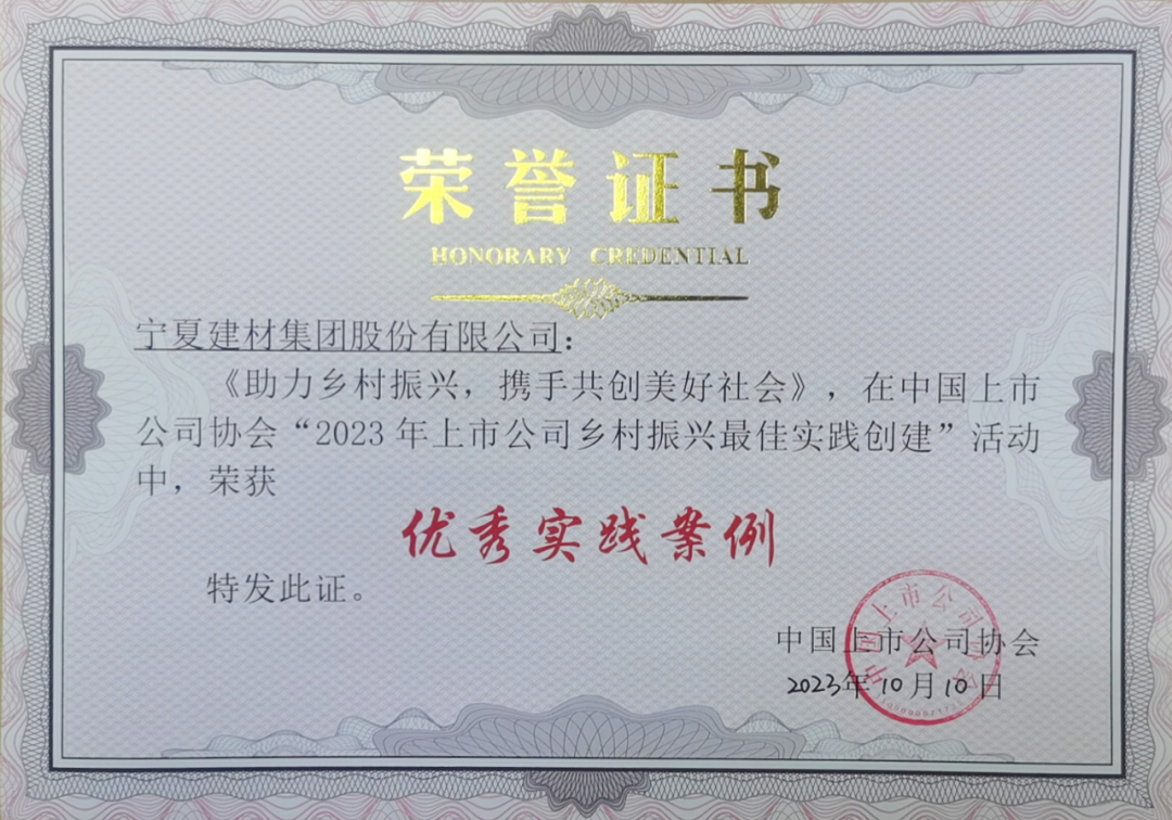 为树立典范,推广优秀经验,引领上市公司奋力在乡村振兴工作上开新局,中国上市公司协会启动“中国上市公司协会 2023 年上市公司乡村振兴最佳实践创建”评选活动,宁夏建材荣获“上市公司乡村振兴优秀实践案例”奖。
