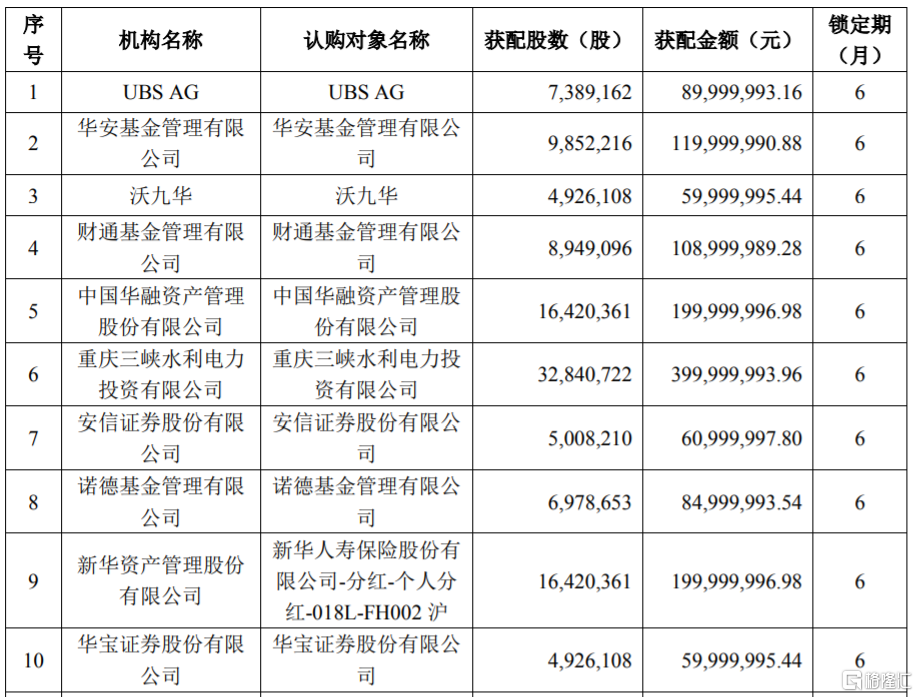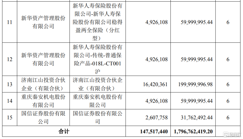 格隆汇8月12日丨涪陵电力(600452.SH)公布非公开发行A股股票发行情况报告书,确定此次发行价格为12.18元/股,发行股数1.48亿股,募集资金总额约17.97亿元。此次发行对象最终确定为15家。具体如下: