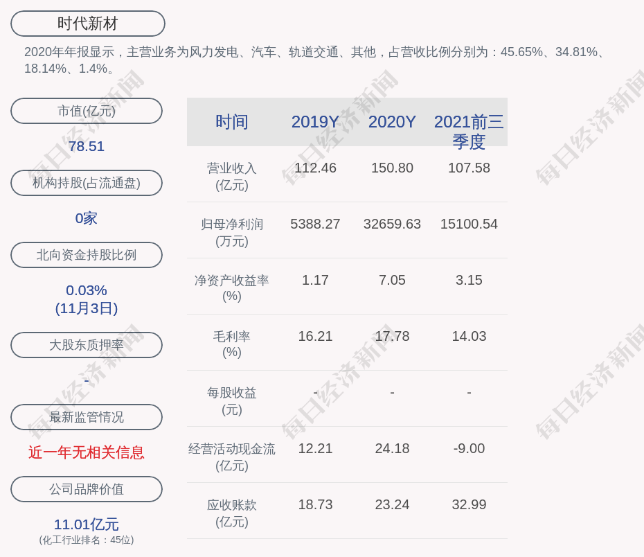 2020年年报显示,时代新材的主营业务为风力发电、汽车、轨道交通、其他,占营收比例分别为:45.65%、34.81%、18.14%、1.4%。