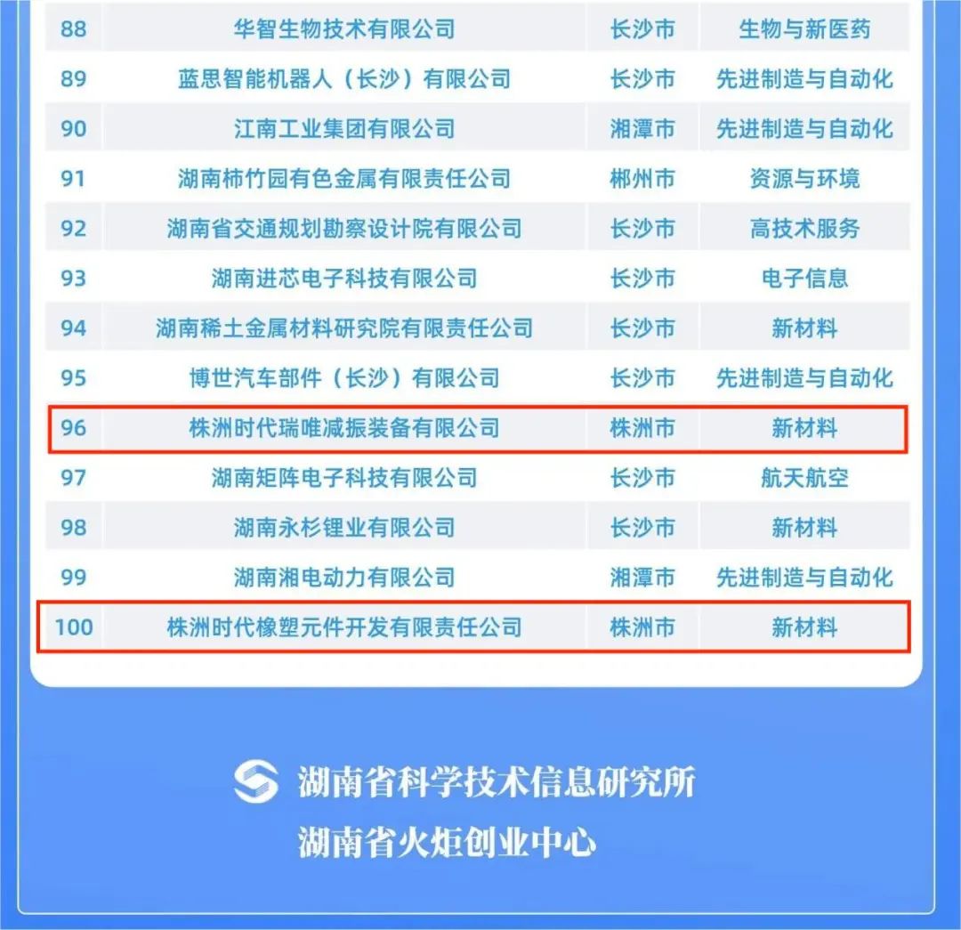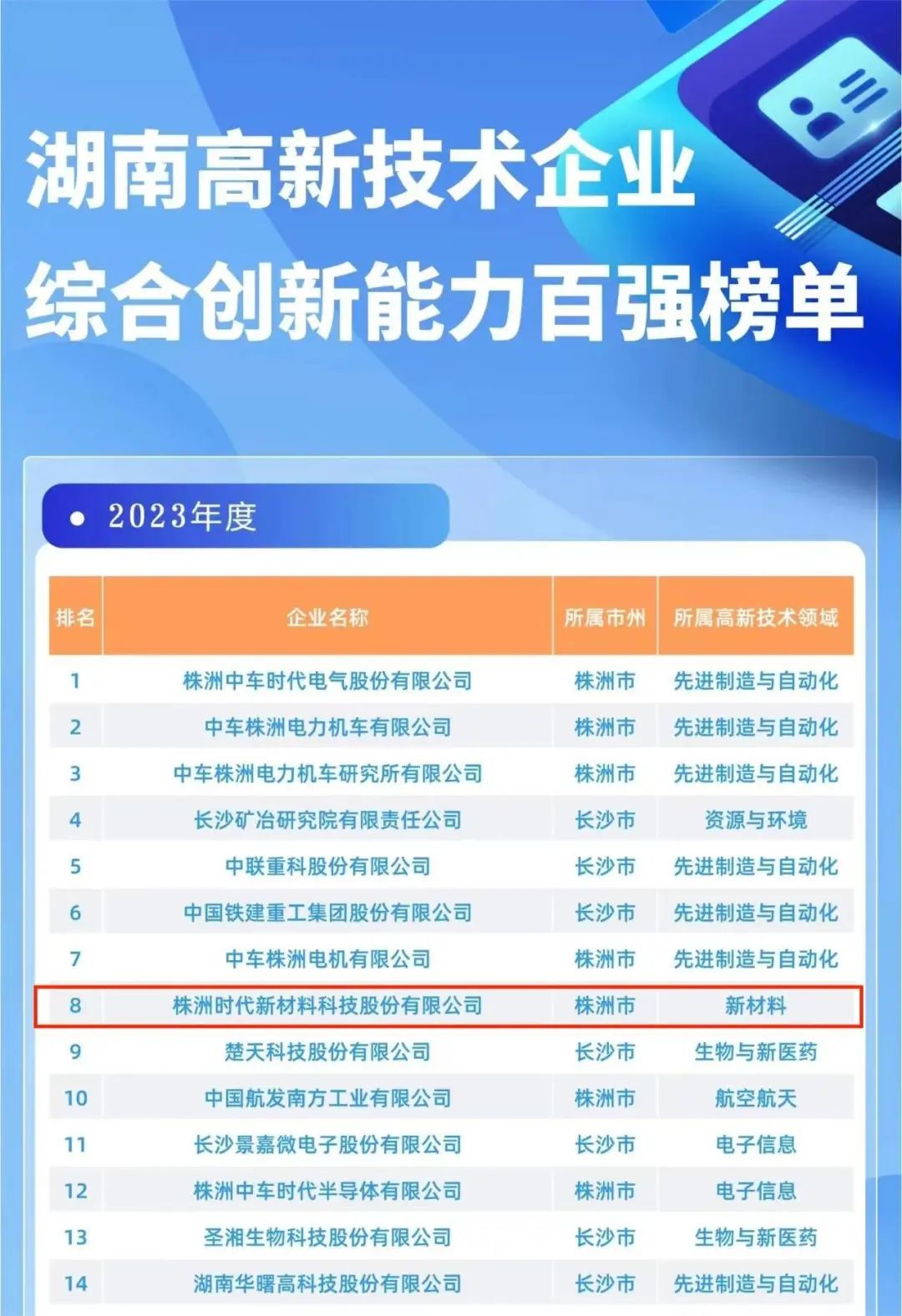 时代新材位列“2023年度湖南省高新技术企业综合创新能力百强榜单”第8,时代新材旗下子公司时代瑞唯、橡塑元件也入选榜单。