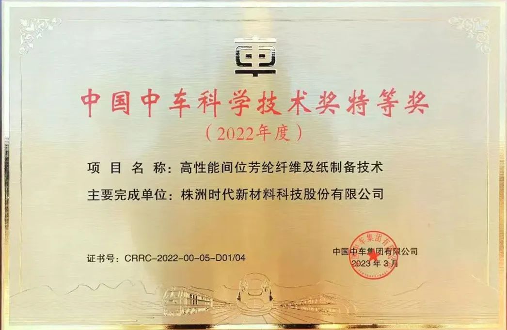 2023年3月,中国中车在山西永济召开2023年科技质量信息化工作会议,大会隆重宣布了《关于2022年度中车科学技术奖励的决定》,公司牵头完成的“高性能间位芳纶纤维及纸制备技术”“大功率轻量化风电叶片设计与制备关键技术研究及工程化应用”两项成果双双喜获特等奖。