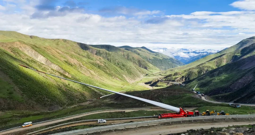 该项目风机装载的叶片由时代新材风电叶片吉林工厂生产制造,全程长途板车运输约4000公里,举升倒运距离约700公里,跋山涉水跨越大半个中国,耗时1个多月,才抵达西藏八宿县。