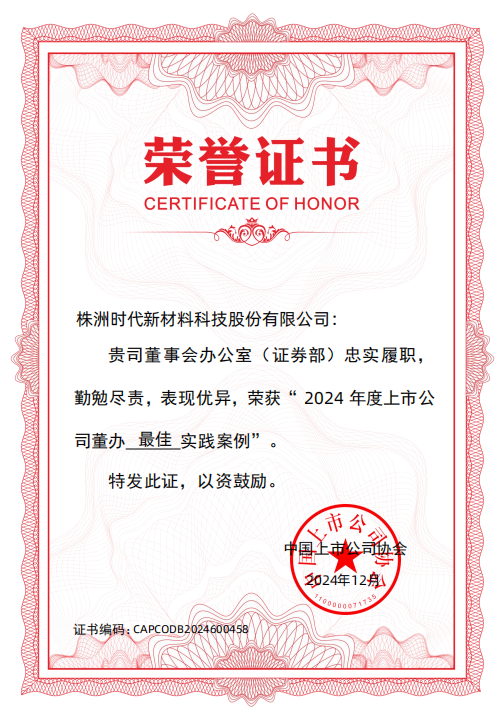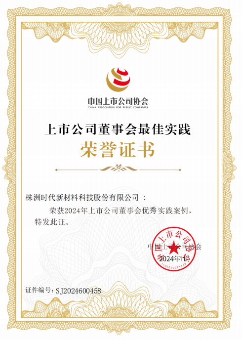 “2024上市公司董事会最佳实践”案例征集活动面向A股市场5300家公司组织开展,旨在进一步促进上市公司董事会合规有效运作,推动提高上市公司规范治理水平。经中国上市公司协会初审、专家委员会评审、诚信核查等环节,时代新材获评“2024上市公司董事会优秀实践”,本年度共有247家企业获评该奖项,占A股市场上市公司总数不足5%。