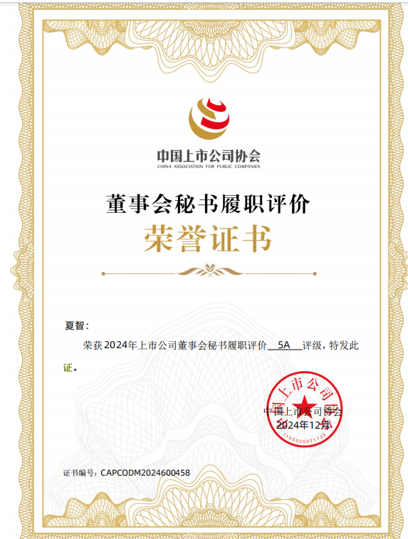 鉴于时代新材在信息披露、规范运作及投资者关系维护等多方面的优异表现,公司董事会秘书夏智先生再次荣获上市公司董事会秘书履职评价最高评级5A级。相比往年,2024年“上市公司董事会秘书履职评价”评选更加严格,A股5300多家上市公司中仅225家上市公司董秘获评5A级,仅有少数公司连续两年蝉联5A评级。