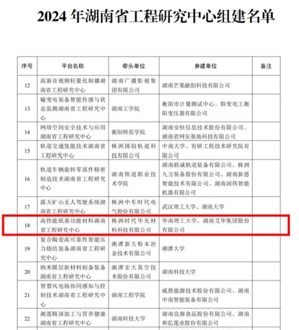 近日,湖南省发展和改革委员会公布了2024年度湖南省工程研究中心组建名单,由时代新材旗下子公司时代华先牵头,华南理工大学、湖南艾华集团股份有限公司联合共建的“高性能纸基功能材料湖南省工程研究中心”顺利获批组建。