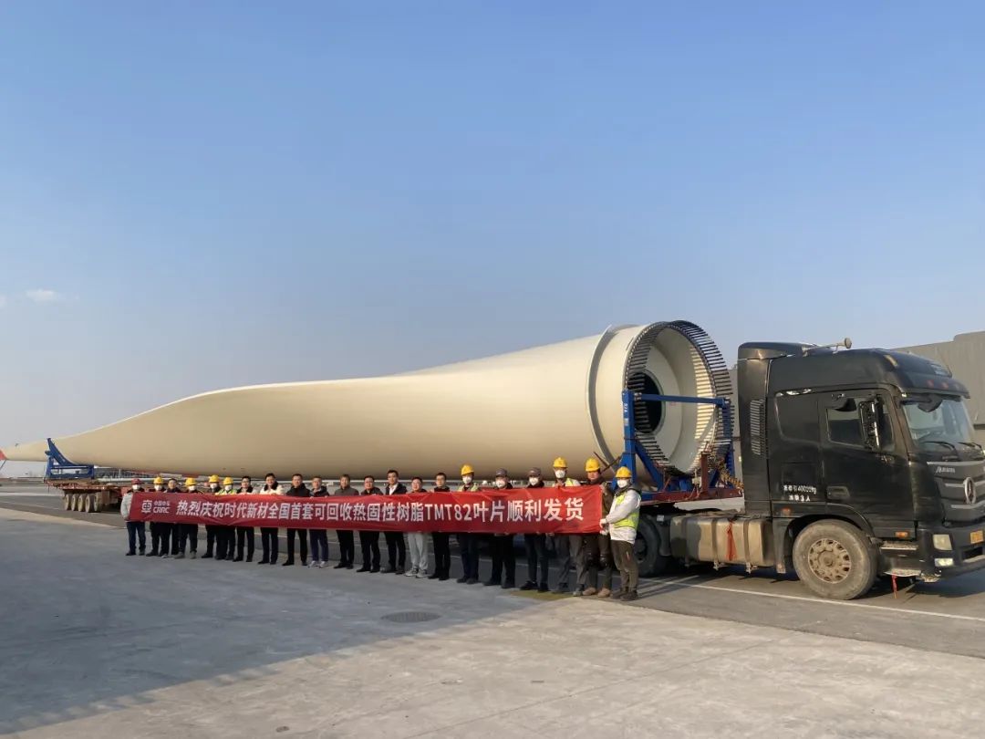 3月17日,时代新材自主研发的国内首套可回收热固性树脂叶片TMT82在公司风电叶片射阳工厂发货。时代新材副总经理彭超义及公司风电产业技术、生产团队参加发货仪式。