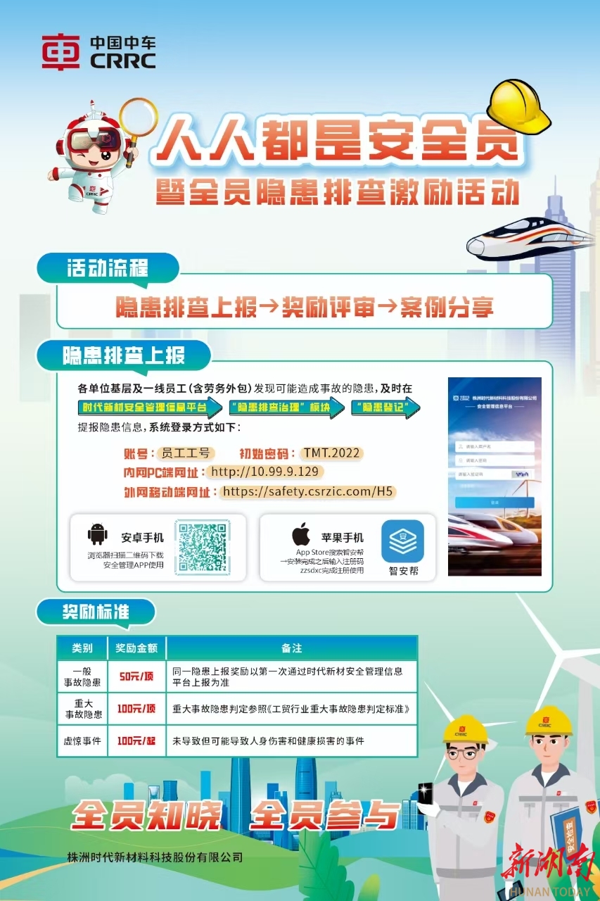 为深入落实《国务院安全生产委员会关于推动建立完善生产经营单位事故隐患内部报告奖励机制的意见》、压实全员安全生产责任制,时代新材于2024年7月22日启动“人人都是安全员”暨全员隐患排查激励活动,目标直指引导员工从“要我安全”向“我要安全”转变,全面提升隐患排查治理效能。