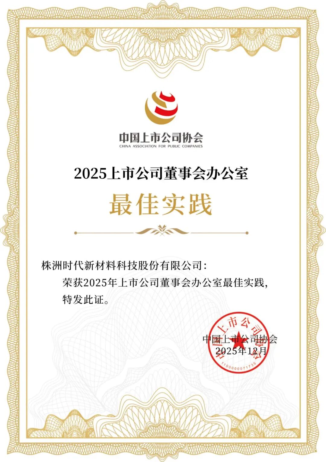 “上证鹰·金质量”奖评选由新华社旗下上海证券报发起和主办,是国内上市公司领域最具权威和影响力的奖项之一,其中“公司治理奖”旨在表彰治理结构完善、运作规范,并在保护投资者权益、履行社会责任方面表现突出的上市公司。 时代新材 获此殊荣,进一步反映了媒体机构和资本市场对公司规范治理的权威肯定。