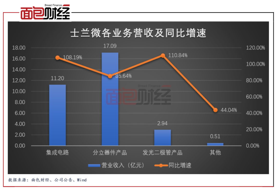 具体业务来看,士兰微三大主要业务均实现较快增长。其中,分立器件产品贡献最多营收,金额为17.09亿元,同比增长85.64%;集成电路业务是公司第二大营收来源,上半年实现营收11.2亿元,同比增长108.19%;发光二极管产品贡献营收2.94亿元,同比增长110.84%。