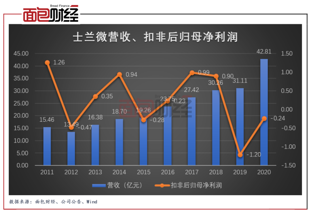 半年报披露后的第一个交易日,士兰微股价下跌9.33%。截至2021年8月19日收盘,公司总市值超过750亿元,市盈率(TTM)约为160倍。?过去十年增收不增利