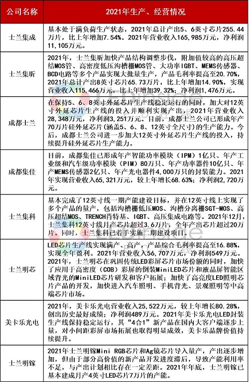 目前,士兰微拥有多家控股参股公司。根据士兰微2021年年报,士兰微主要控股参股公司在2021年主要的生产、经营情况如下:
