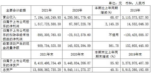目前,士兰微主要产品包括集成电路、半导体分立器件、LED(发光二极管)产品等三大类。2021年,士兰微实现营业收入为719,414.82万元,同比增长68.07%;归属于上市公司股东的净利润为151,772.56万元,同比增长2145.25%。