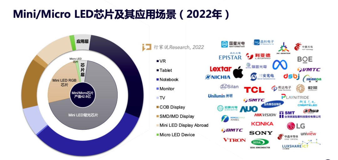 回看2022年,产业多数细分领域表现平淡,但Mini/Micro LED依旧保持着增长。从上游的LED芯片端看,Mini LED背光芯片、Mini LED RGB芯片以及Micro LED芯片的总产值达到42.6亿元,同比约有50%的增长。