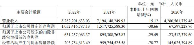 2022年,公司实现营业收入82.82亿元,同比增长15.12%;归属于上市公司股东的净利润10.52亿元,同比减少30.66%;归属于上市公司股东的扣除非经常性损益的净利润6.31亿元,同比减少29.49%;经营活动产生的现金流量净额2.04亿元,同比减少78.77%。