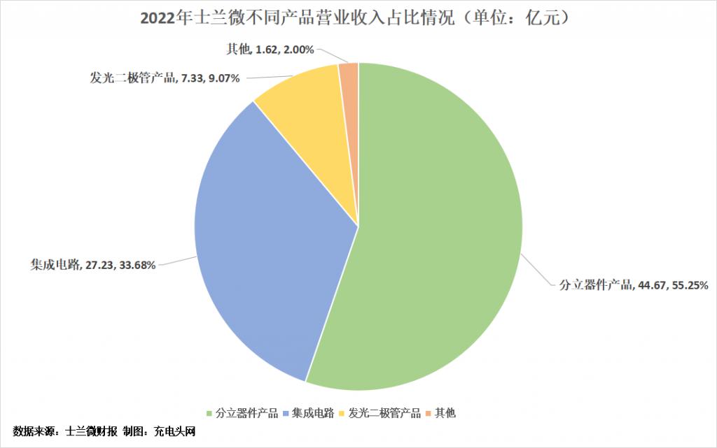 报告期内,士兰微各板块业务总体经营情况如上图。2022 年,士兰微分立器件产品营业收入 44.67 亿元,占公司营业收入的 55.25%;集成电路营业收入 27.23 亿元,占公司营业收入的 33.68%。发光二极管产品营业收入 7.33 亿元,占公司营业收入的 9.07%;其他营业收入 1.62 亿元,占公司营业收入的 2.00%。
