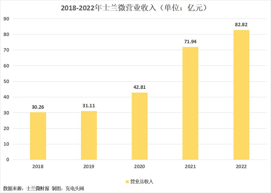 根据士兰微报告数据显示,2018 年-2022 年这五年来,士兰微营业收入分别为 30.26 亿元、31.11 亿元、42.81 亿元、71.94 亿元、82.82 亿元,同比增长 10.36%、2.80%、37.61%、68.07%和 15.12%。