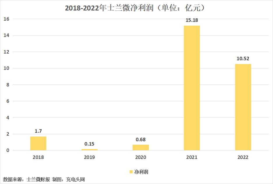 2018 年— 2022 年,士兰微净利润分别为 1.70 亿元、0.15 亿元、0.68 亿元、15.18 亿元、10.52 亿元,同比增长 0.58%、-91.47%、365.16%、2145.25%和-30.66%。