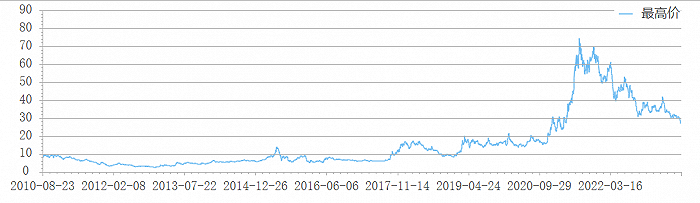 股价的大涨正是由于机构炒作所致。2019年年末有90家机构持有该上市公司的股票,2020年年末达194家,2021年6月末达402家,2022年6月末达477家。机构不断进入埋伏,股价也一路走高,从2020年12月9日的20元附近一路上扬,最高涨至2021年7月27日的74.4元。而后股价一路下跌,截至2023年8月21日报25.13元/股,距离最高点已下跌66%。