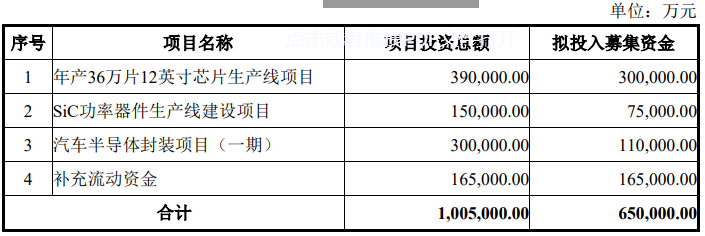 《电鳗财经》查阅信息发现,士兰微本次募资规模高达65亿元,主要投向12英寸芯片产线、SiC功率器件产线、汽车半导体封装等项目,总投资额100.5亿元,拟使用募资占比64.68%。
