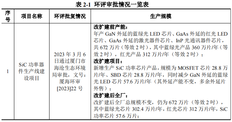 项目新增SiC产能规模为MOSFET芯片28.8万片/年、SBD芯片28.8万片/年,同时减少GaN外延的蓝绿光LED芯片57.6万片/年(其外延产能不变,多余外延片外售)、总共为芯片产能672万片(等效2吋)。