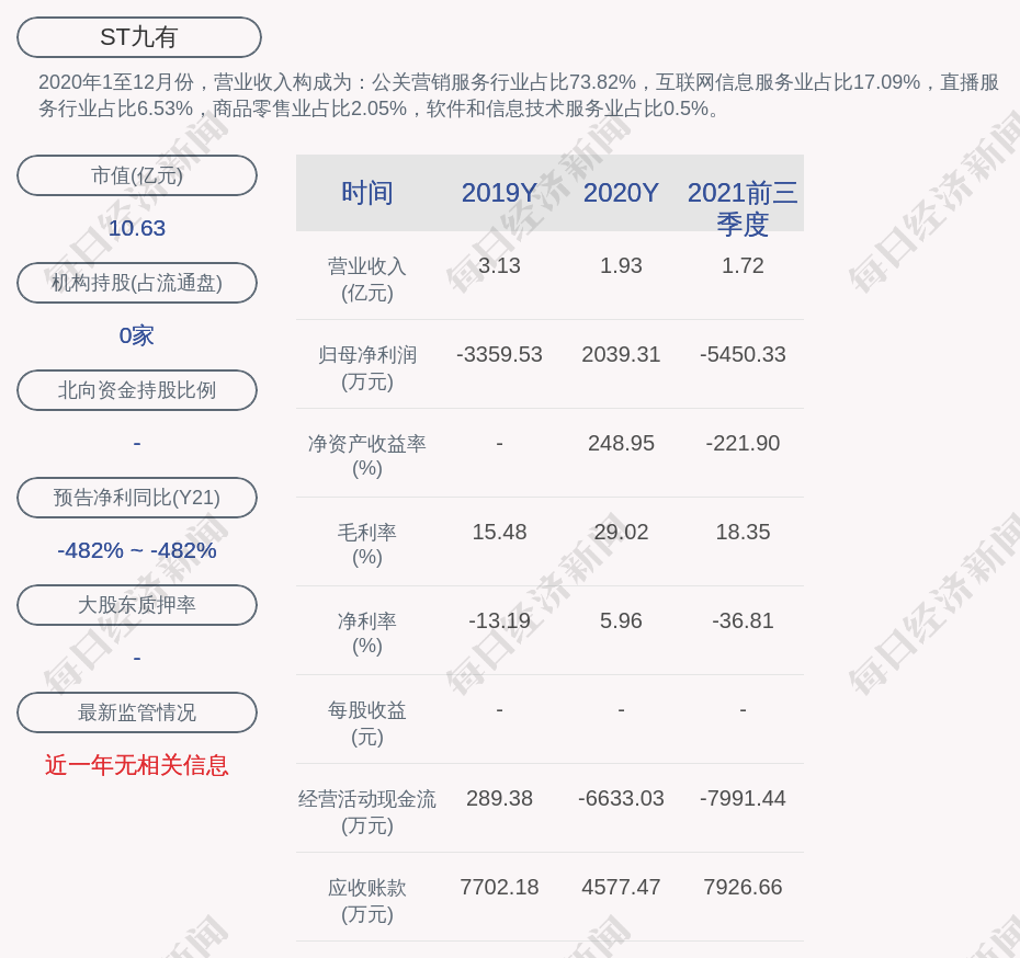 2020年1至12月份,ST九有的营业收入构成为:公关营销服务行业占比73.82%,互联网信息服务业占比17.09%,直播服务行业占比6.53%,商品零售业占比2.05%,软件和信息技术服务业占比0.5%。