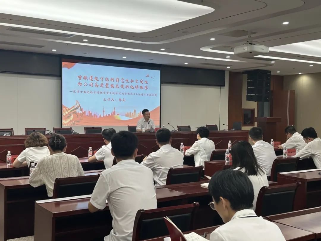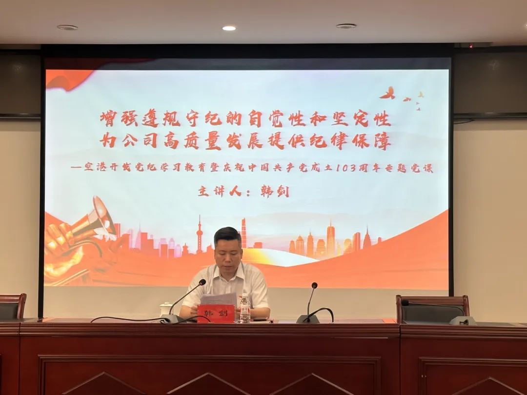 根据空港开发党委关于“庆祝中国共产党成立103周年系列活动工作方案”的要求,空港股份机关党支部结合工作实际,邀请空港开发党委委员、副经理韩剑以“增强遵规守纪的自觉性和坚定性为公司高质量发展提供纪律保障”为题讲授专题党课。