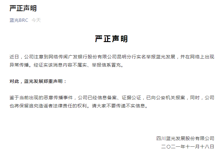 11月18日,蓝光发展发布严正声明称,近日,公司注意到网络传闻广发银行股份有限公司昆明分行实名举报蓝光发展,并在网络上出现异常传播。经证实该消息内容不属实、举报信系冒充。