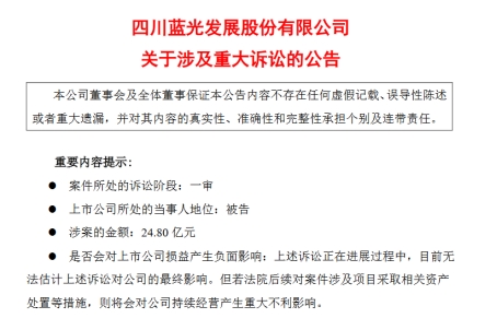 同日,蓝光发展发布另一则公告显示,因其出现的阶段性流动性紧张及债务风险,部分金融机构及合作方向公司提起了诉讼或仲裁。新增诉讼涉案金额合计24.80亿元的25起诉讼进入一审阶段。其中,建设工程施工合同纠纷16宗,合同纠纷3宗,公司债券交易纠纷4宗,金融债券交易纠纷1宗,融资租赁交易纠纷1宗。