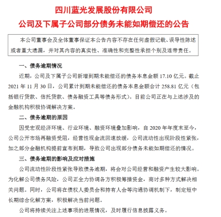 11月30日晚,蓝光发展(600466.SH)发布《公司及下属子公司部分债务未能如期偿还的公告》。公告称,蓝光发展及下属子公司新增到期未能偿还的债务本息金额17.10亿元,截至2021年11月30日,蓝光发展累计到期未能偿还的债务本息金额合计258.81亿元(包括银行贷款、信托贷款、债务融资工具等债务形式)。