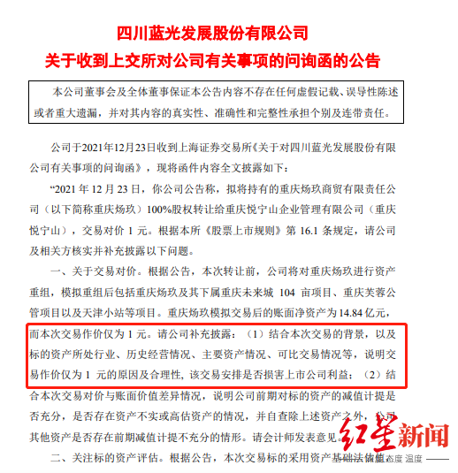 红星资本局了解到,四川蓝光发展股份有限公司(以下简称“蓝光发展”600466.SH)12月23日发布公告称,该公司拟将旗下全资子公司持有的重庆炀玖商贸有限责任公司(以下简称“重庆炀玖”) 100%股权转让给重庆悦宁山企业管理有限公司(以下简称重庆悦宁山)。不过,令人奇怪的是,此次转让股权的对价为1元钱,而重庆炀玖拟交易后的净资产为14.84亿元。