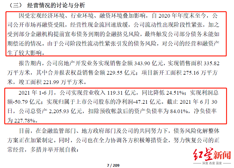 不过,在蓝光发展今年半年报中显示,截至2021年6月30日,蓝光发展扣除预收帐款后的资产负债率为84.01%,净负债率为227.78%,两项指标均已踩中“三道红线”。另外,雪上加霜的是,根据蓝光发展公告称,截至2021年11月30日,蓝光发展累计到期未能偿还的债务本息金额合计258.81亿元(包括银行贷款、信托贷款、债务融资工具等债务形式)。而在现金流方面,截至2021年6月30日,货币资金余额为100.29亿,其中:可自由动用资金为3.30亿,各类受限或者限定用途的资金96.99亿元。
