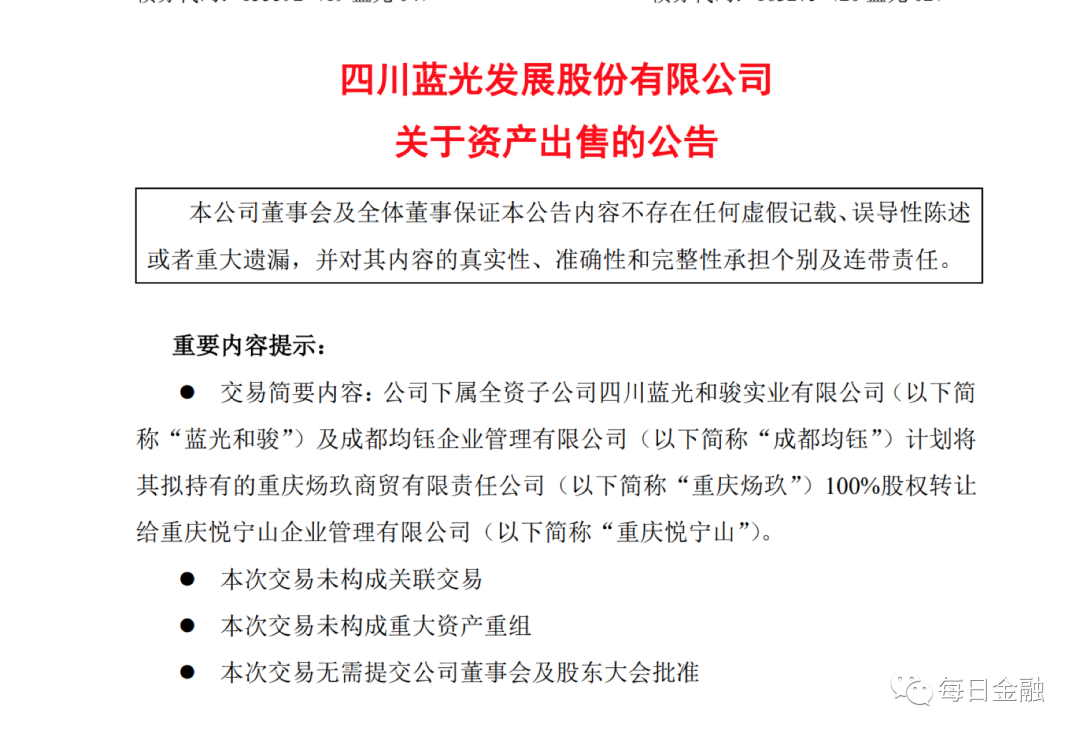 12月23日晚间,蓝光发展(600466.SH)公告称,公司下属全资子公司四川蓝光和骏实业有限公司及成都均钰企业管理有限公司计划将其拟持有的重庆炀玖商贸有限责任公司100%股权转让给重庆悦宁山企业管理有限公司。