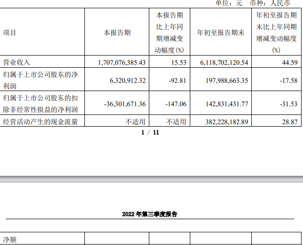 今年前三季度,公司实现营业收入61.19亿元,同比增长44.59%;实现归属于上市公司股东的净利润1.98亿元,同比减少17.58%;实现归属于上市公司股东的扣除非经常性损益的净利润1.43亿元,同比减少31.53%;经营活动产生的现金流量净额为3.82亿元,同比增长28.87%。