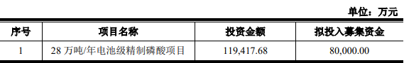 本次非公开发行股票的募集资金总额(含发行费用)不超过80000万元,扣除发行费用后募集资金将用于投资建设28万吨/年电池级精制磷酸项目。
