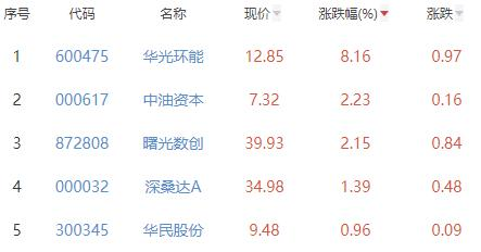 其中,华光环能、中油资本、曙光数创、深桑达A、华民股份位列板块涨幅前五位,涨幅分别为8.16%、2.23%、2.15%、1.39%、0.96%。