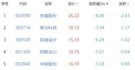 宏盛股份、泉为科技、启迪设计、陕鼓动力、华统股份位列涨幅榜后五位,涨幅分别为-8.48%、-7.04%、-6.24%、-5.61%和-5.58%。