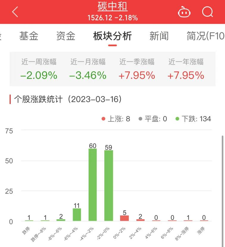 中国经济网北京3月16日讯今日,碳中和板块整体跌幅2.18%,其中8只股票上涨,134只股票下跌。