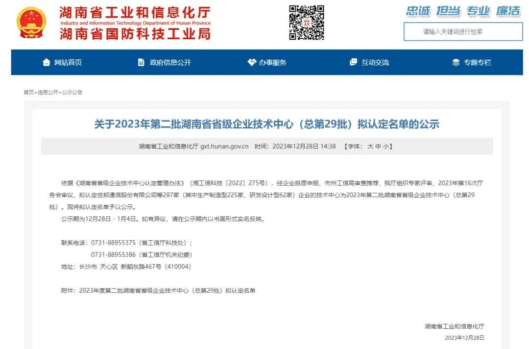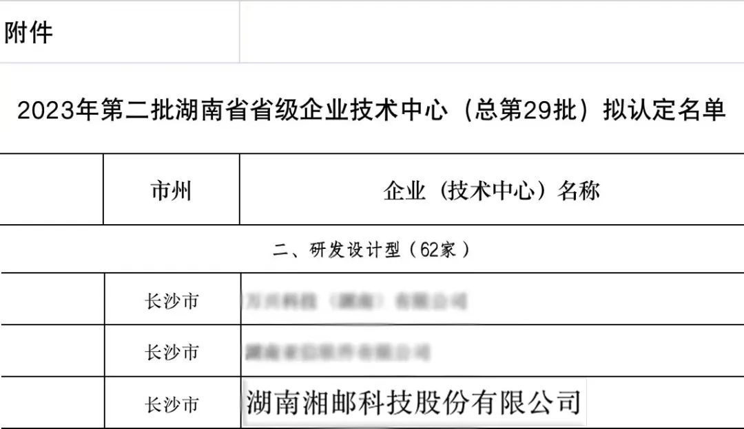 近日,《2023年第二批湖南省省级企业技术中心(总第29批)拟认定名单》完成公示,湖南湘邮科技股份有限公司成功被认定为“湖南省省级企业技术中心”。