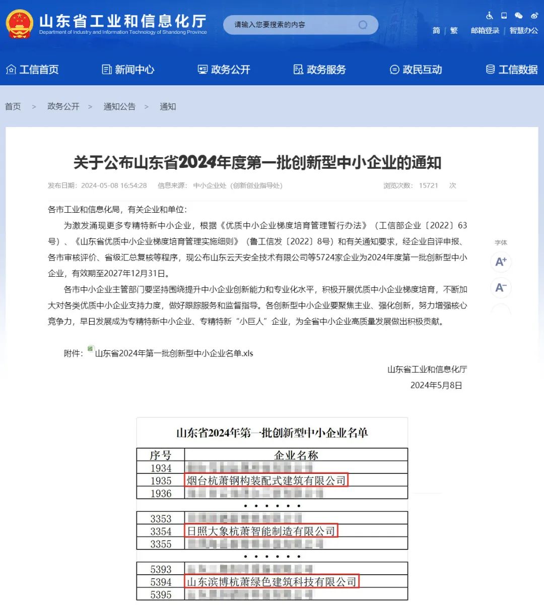 近期,山东省工业和信息化厅发布了《关于关于公布山东省2024年度第一批创新型中小企业的通知》,杭萧钢构战略合作参股公司——烟台杭萧钢构装配式建筑有限公司、日照大象杭萧智能制造有限公司、山东滨博杭萧绿色建筑科技有限公司榜上有名。