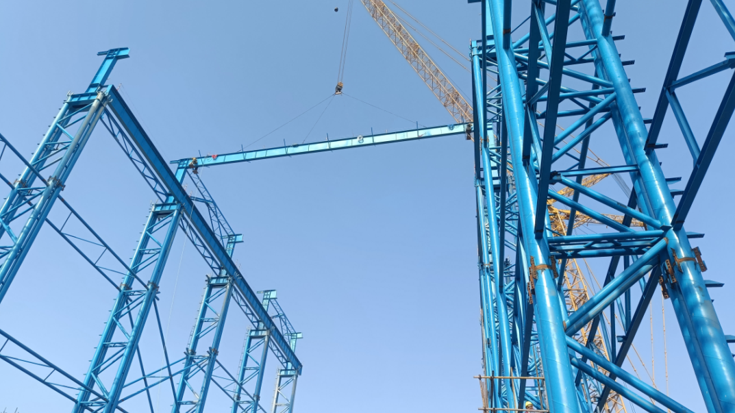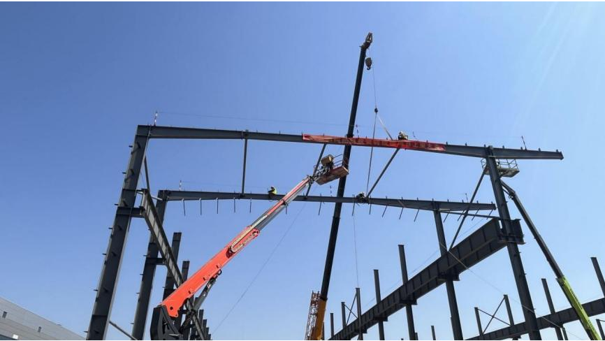 该项目位于山东省青岛胶州市上合示范区,项目总建筑面积41749.12平方米。结构主体为门式刚架厂房+钢框架办公楼。钢筋桁架楼承板面积超12910平方米,车间部分围护面积超8万平米。该项目近期完成首榀屋架梁的吊装。