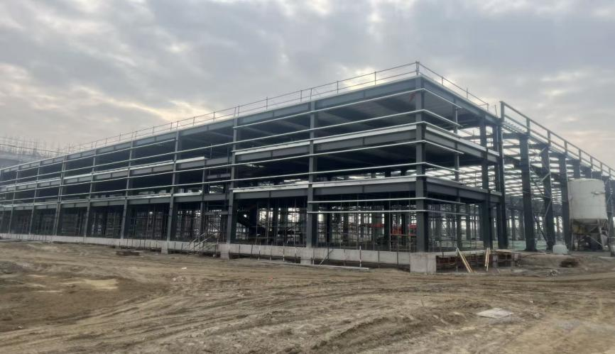 该项目位于江苏省泰州市,建设部分主要包括厂房一、厂房二,总建筑面积49553平方米。其中,厂房一建筑面积为28918.85平方米,结构形式为门式刚架、砼框架;厂房二建筑面积为20634.2平方米,结构形式为门式刚架、钢框架;钢框架楼面采用非组合楼承板,屋面及墙面均为双层板。目前厂房一主体结构完成60%;厂房二主体结构完成80%。
