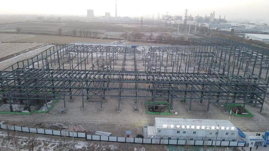 该项目位于内蒙古自治区呼和浩特市赛罕区南部的化工片区,占地约134亩,总建筑面积约3.6万平方米,主要业态是厂房,包括2个车间和辅助用房。目前两个车间主体钢结构已全部封顶,后续施工内容正在有序进行中。