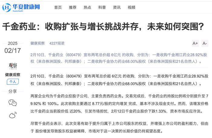 千金药业的未来,既充满机遇,也面临重重挑战。此次 6 亿元的增发收购是扩张西药业务的重要一步,但是否能真正提振业绩、实现股东利益最大化,仍需时间验证。面对产品质量争议、财务下滑、股价波动等问题,千金药业需要拿出更具说服力的长期发展战略,才能真正赢得资本市场与消费者的信任。