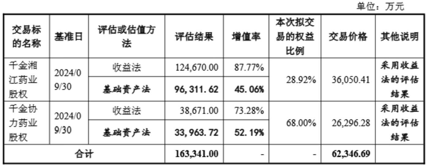 此次湘江药业、协力药业的评估增值率分别为87.77%、73.28%。从市盈率来看,笔者以2024年净利润为参考计算得出,湘江药业收购市盈率约为11.76倍(整体估值12.47亿元/净利润1.06亿元),协力药业收购市盈率约为16.24倍(整体估值3.87亿元/净利润2383.69万元),千金药业截至9月23日的动态市盈率约为18.06倍。