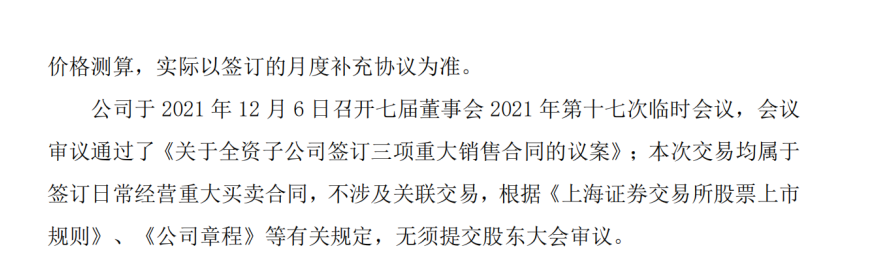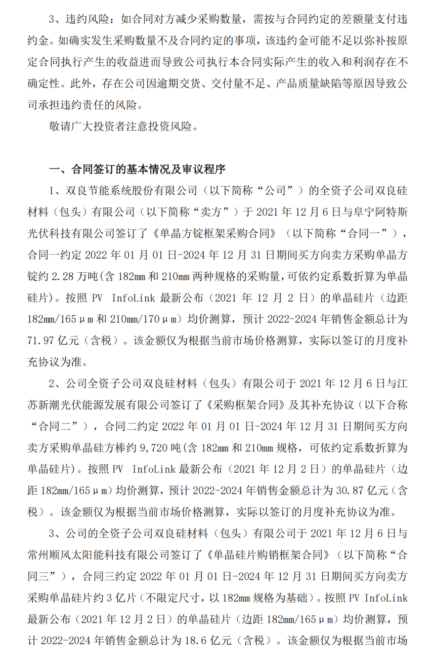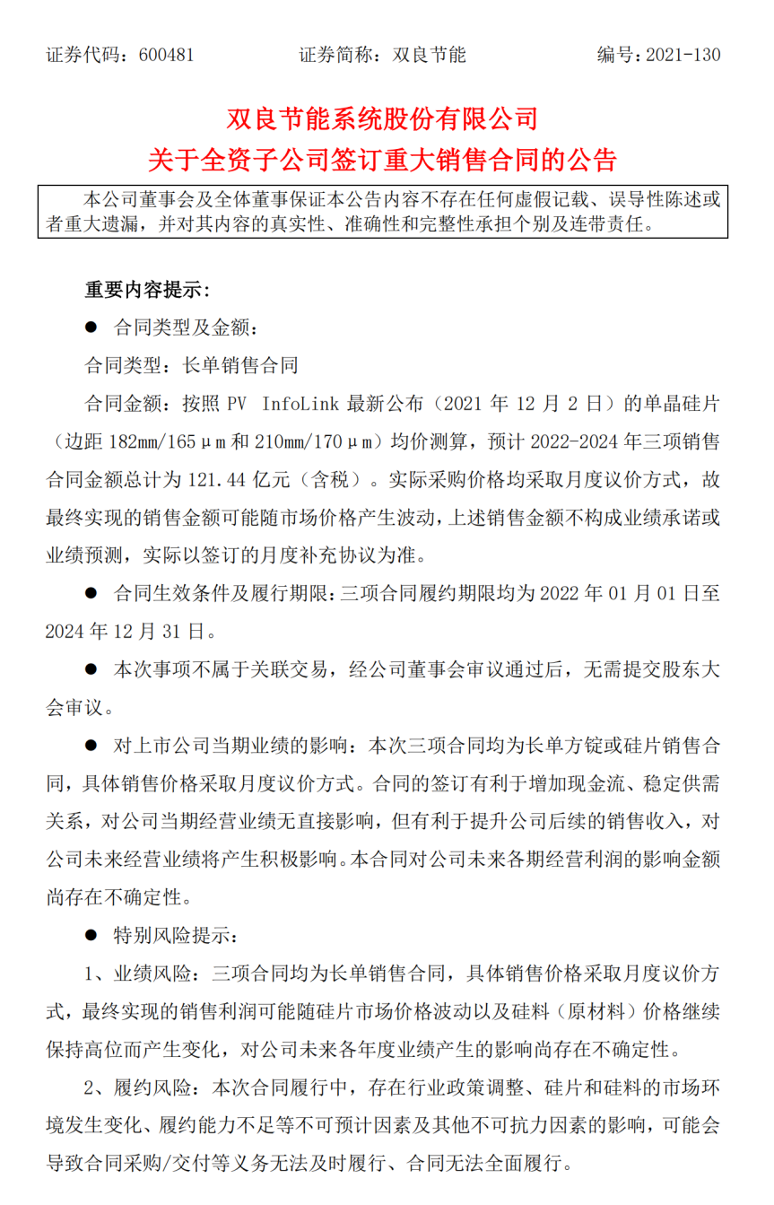双良节能(600481)公告,全资子公司双良硅材料(包头)有限公司与阜宁阿特斯光伏科技有限公司签订了《单晶方锭框架采购合同》,与江苏新潮光伏能源发展有限公司签订了《采购框架合同》及其补充协议,与常州顺风太阳能科技有限公司签订了《单晶硅片购销框架合同》。按照PVInfoLink最新公布的单晶硅片均价测算,预计2022-2024年三项销售合同金额总计为121.44亿元(含税)。