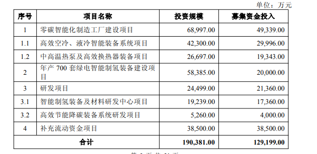 具体项目包括:零碳智能化制造工厂建设项目、高效空冷、液冷智能装备系统项目、中高温热泵及高效换热器装备项目、年产 700 套绿电智能制氢装备建设项目、研发项目、智能制氢装备及材料研发中心项目、高效节能降碳装备系统研发项目,分别投向4.93亿元、3亿元、1.93亿元、2亿元、2.14亿元、1.74亿元、4000万元,剩余3.85亿元用于补流。