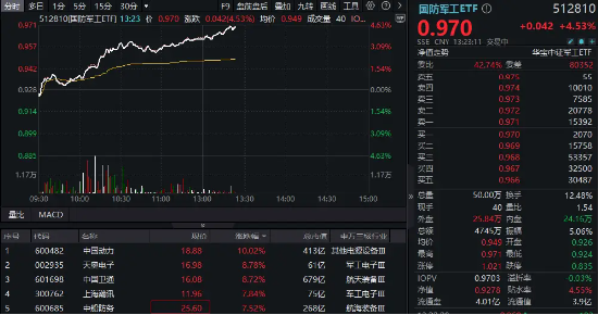 午后,国防军工板块继续走高,国防军工ETF(512810)场内价格飙升至4.5%上方!成份股方面,中船系、中航系全线爆发,中国动力(18.880, 1.72, 10.02%)涨停!中国卫通(16.060, 1.27, 8.59%)涨近9%,中航电测(38.930, 2.43, 6.66%)涨超7%!