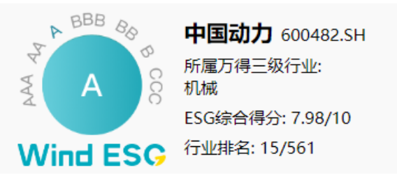 近日,知名权威ESG评级机构万得(Wind)更新了中船集团旗下中国动力最新一期的ESG评级结果,中国动力凭借在ESG领域的实践和成效,荣获“A”级评级,综合得分在机械行业561家上市公司中位居第15位。