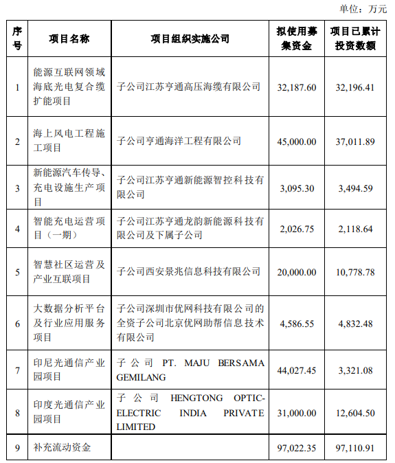 最近,2021年4月27日,亨通同意将原投入于智慧社区运营及产业互联项目的剩余募集资金9,221.22万元及利息全部用于永久补充流动资金。