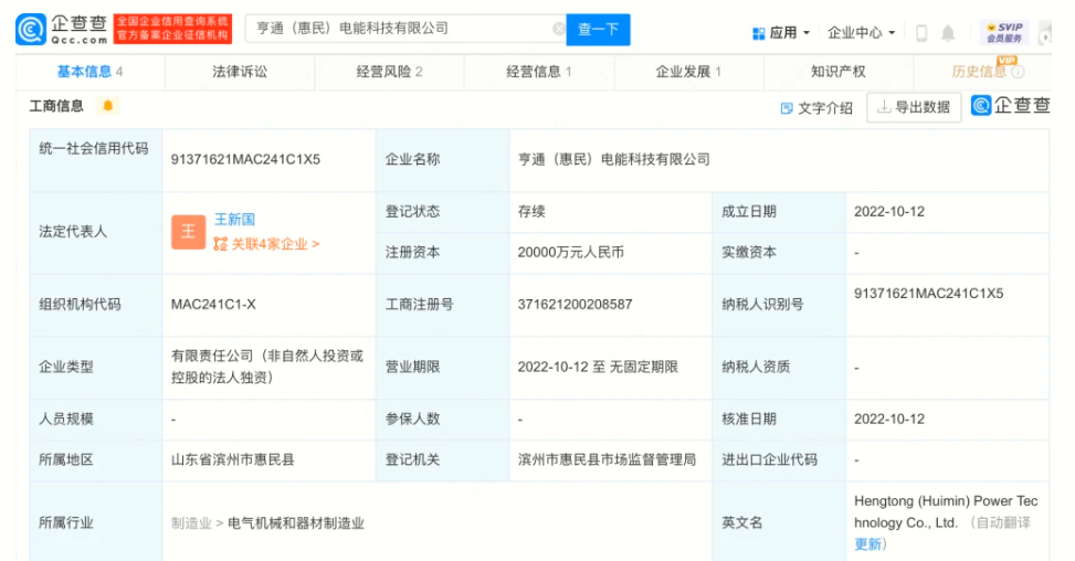 近日,亨通(惠民)电能科技有限公司注册成立,成为亨通光电旗下又一家新公司。据公开资料显示,该公司法定代表人为王新国,注册资本2亿元人民币,经营范围包含:电力设施器材制造;光伏设备及元器件制造;太阳能发电技术服务等,由亨通光电关联公司江苏亨通电力电缆有限公司100%控股。